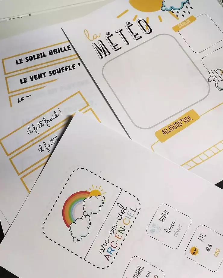 On continue avec les rituels et c'est au tour de la météo (la température est a noter au feutre effaçable; l'encadré jaune est prévu pour les phrases qui décrivent le temps)